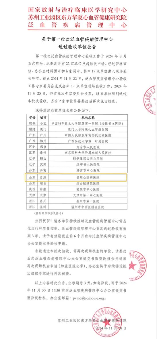 2024年11月28日,泛血管疾病管理中心发布《关于第一批次泛血管疾病管理中心通过验收单位公告》,青岛大学附属日照医院/日照心脏病医院顺利通过第一批次泛血管疾病管理中心验收,成为日照市首家通过泛血管疾病管理中心验收的单位,标志着医院为日照市泛血管疾病防治工作再添新力量。
