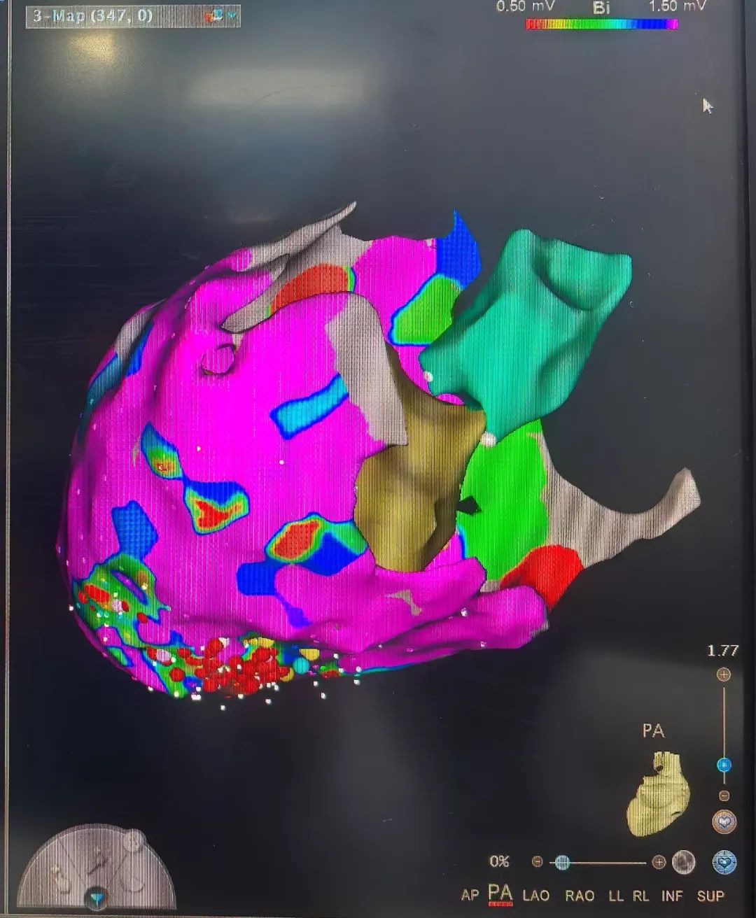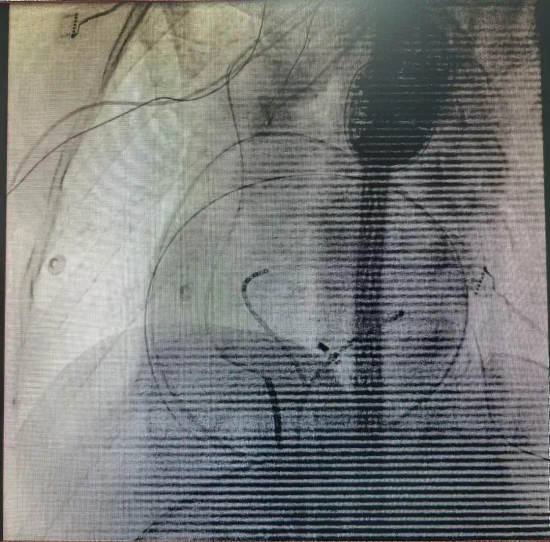 手术在导管室进行。在导管室的配合下,解新星主任首先穿刺股动脉进入左心室行心内膜标测,如术前所料,患者心内膜电压正常,无明显异常电位,且室早发作时心内膜激动不提前,高度提示心外膜起源可能。干性心包穿刺选择剑突下途径,多体位X线透照确定穿刺方向,穿刺针顺利突破壁层心包,送入导丝确定穿刺成功。心外膜标测显示左心室下壁中部有片状低电压疤痕区,室早时局部电位提前,局部起搏与患者自发室性早搏匹配良好,随即对低电压区及异常电位区行片状消融,术后反复诱发不能诱发室速。术后未见心包积液,手术顺利结束。目前该患者已顺利出院。